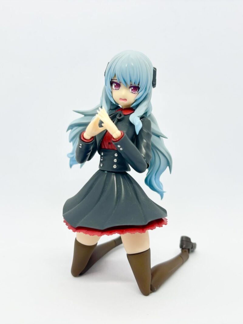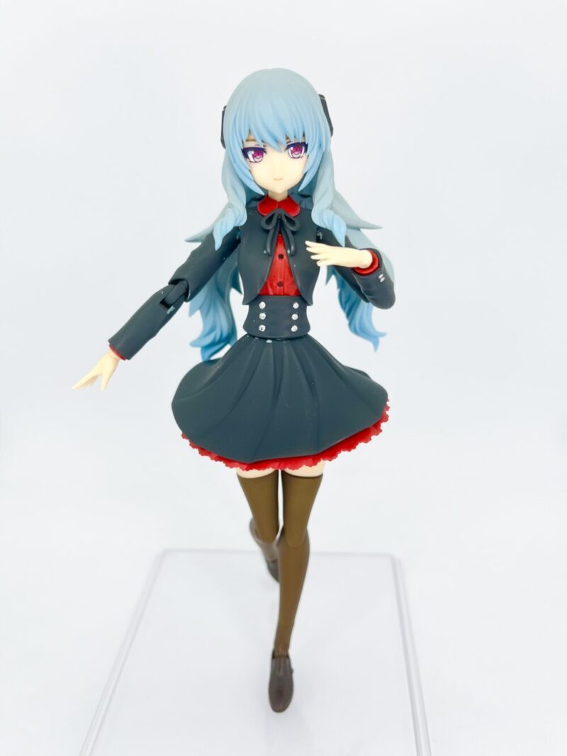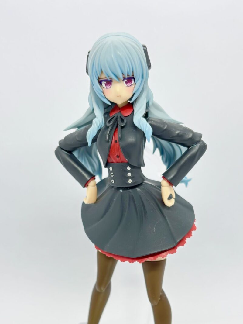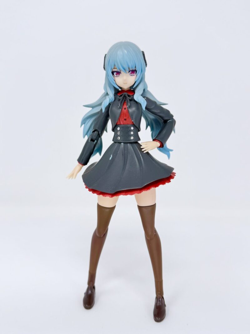 名前は「カリーナ」です。フレームアームズ・ガールのドゥルガーⅠと創彩少女庭園の佐伯リツカ(冬服)のミキシングで作成しました。髪の毛の色は雪ミクの青、制服の色はガンダムカラーのティターンズブルー1を使っています。ブルーとは言ってますが黒色ですよね…個人的には黒すぎない黒でお気に入りの色だったりします。