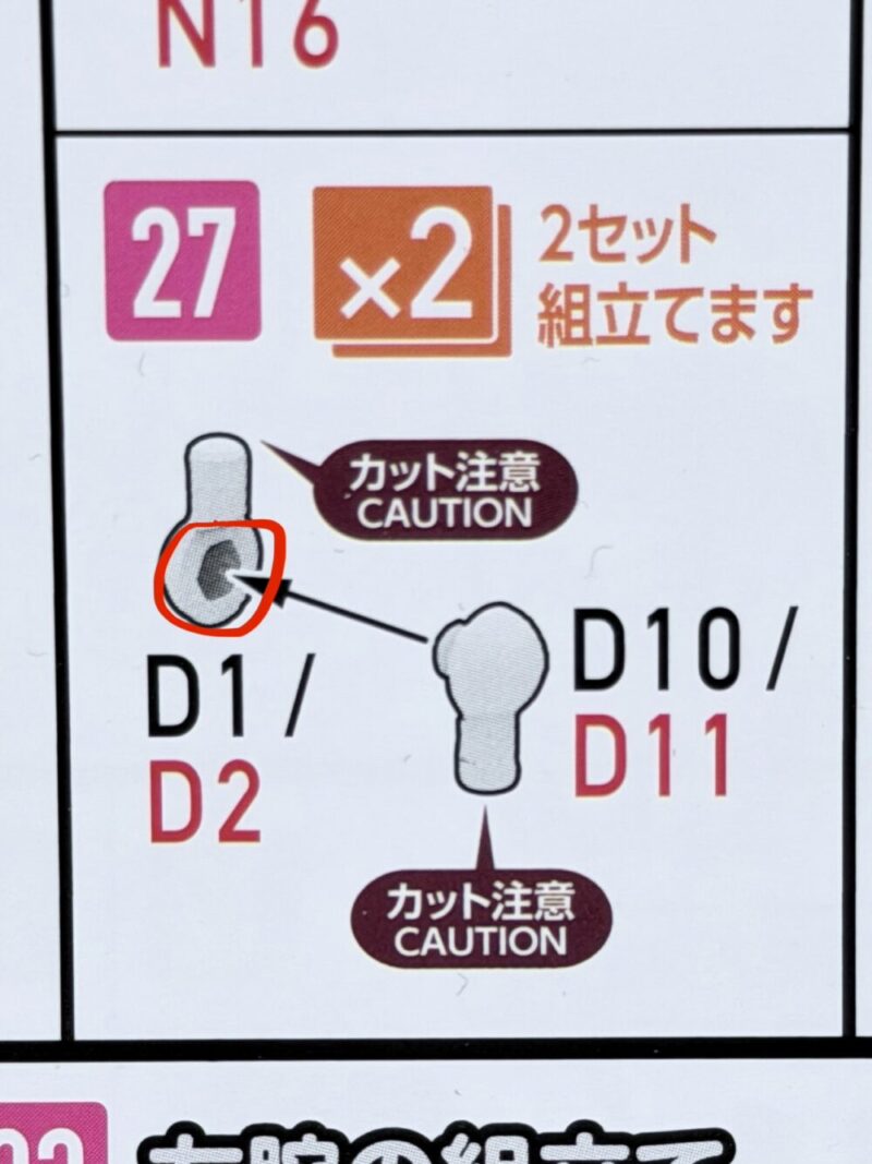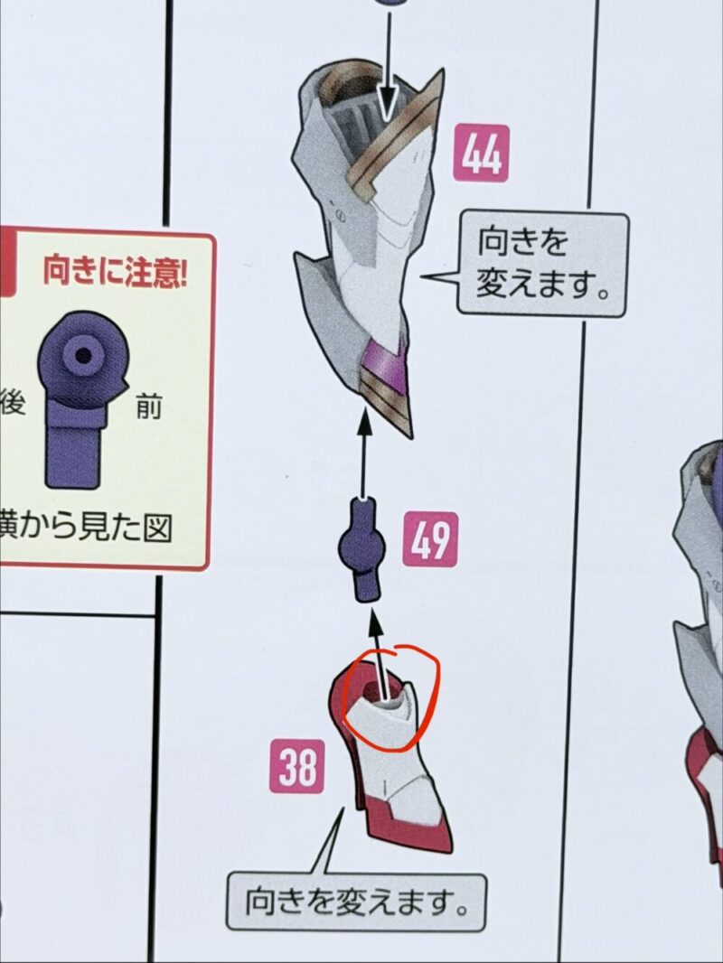 特にこの赤丸が付いている部分は、そのまま組むととても固いので、棒ヤスリかなにかで削るかグリスを塗ってある程度動かしやすくした方がいいです。